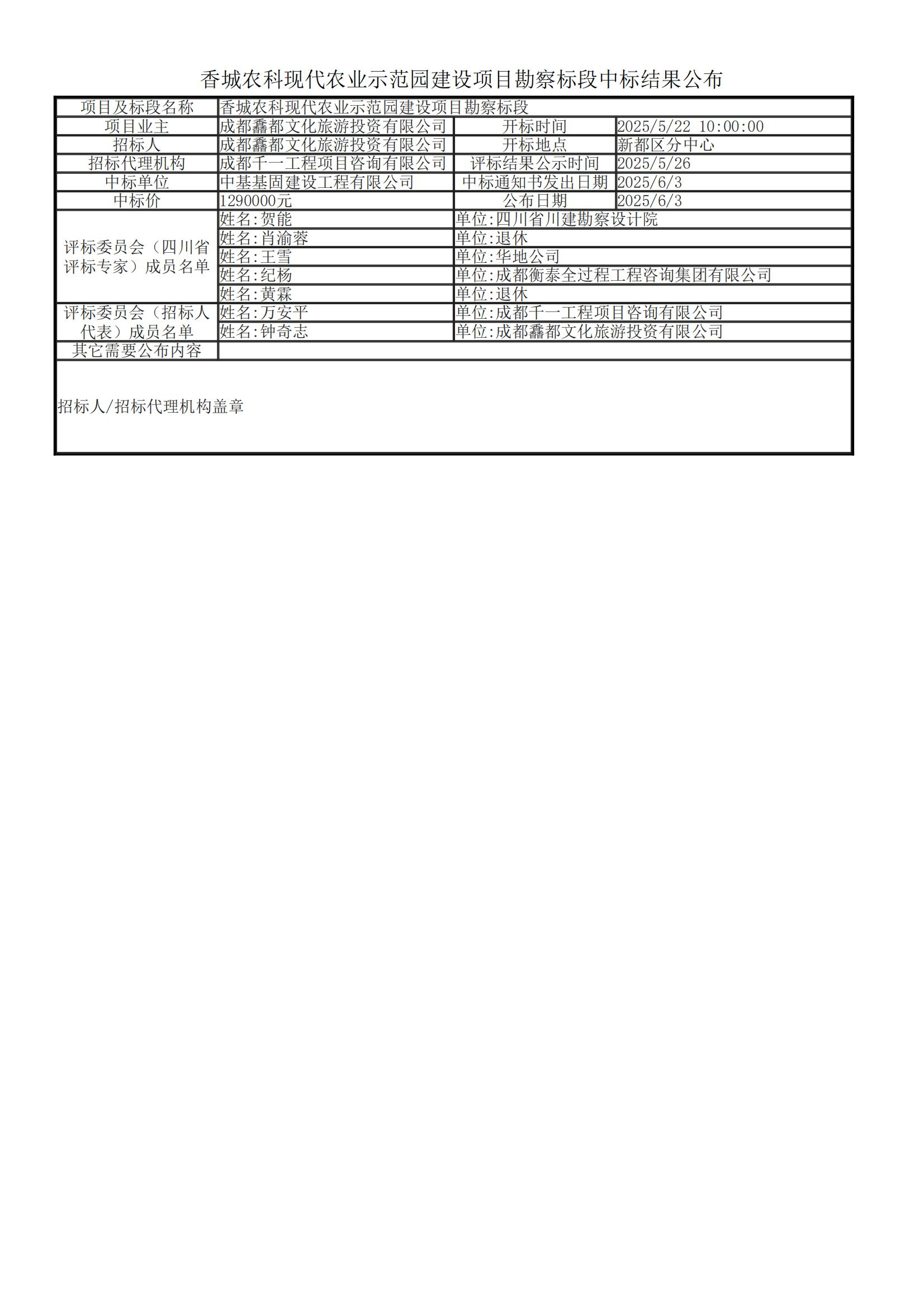 香城农科现代农业示范园建设项目勘察标段中标结果公布
