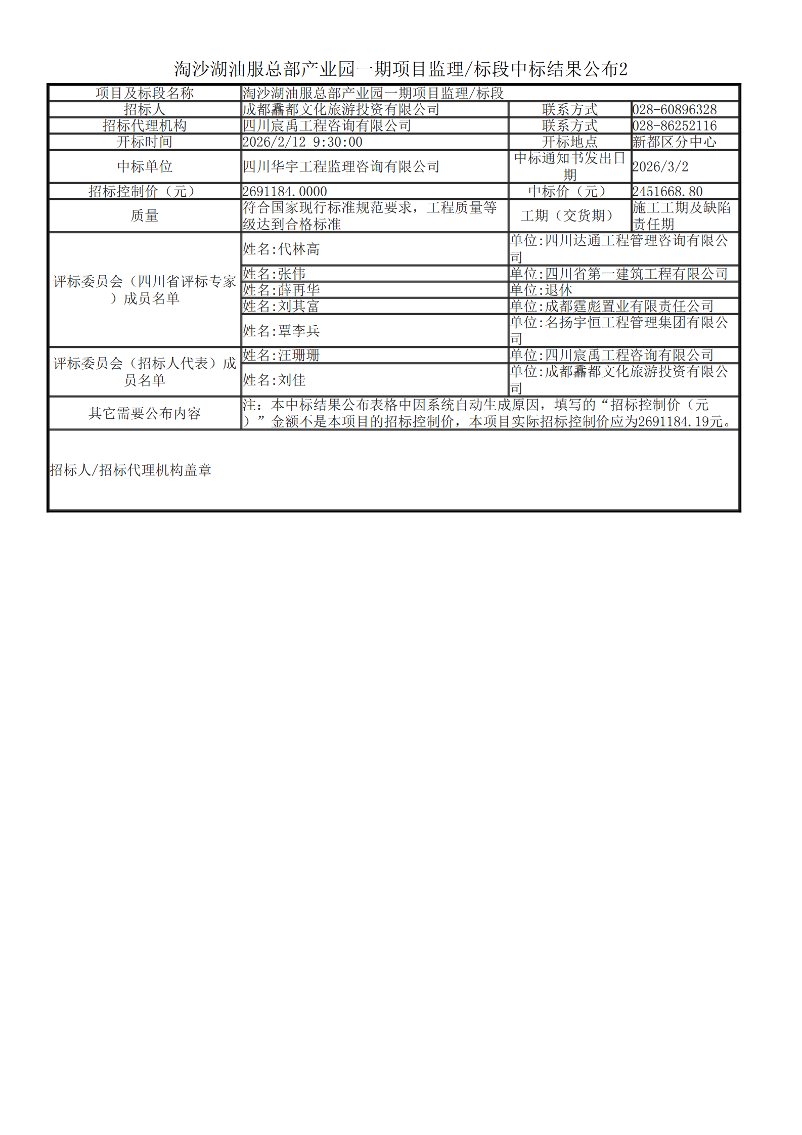 淘沙湖油服总部产业园一期项目监理/标段中标结果公布2